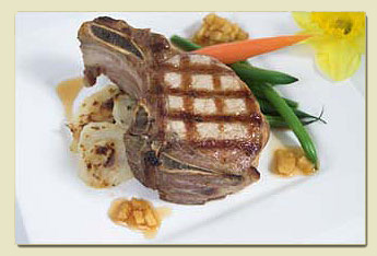 - Cider Brined Pork Chop with Gala Apple Chutney, Roasted Ciopollini Onions, and Sweet Potato Puree
